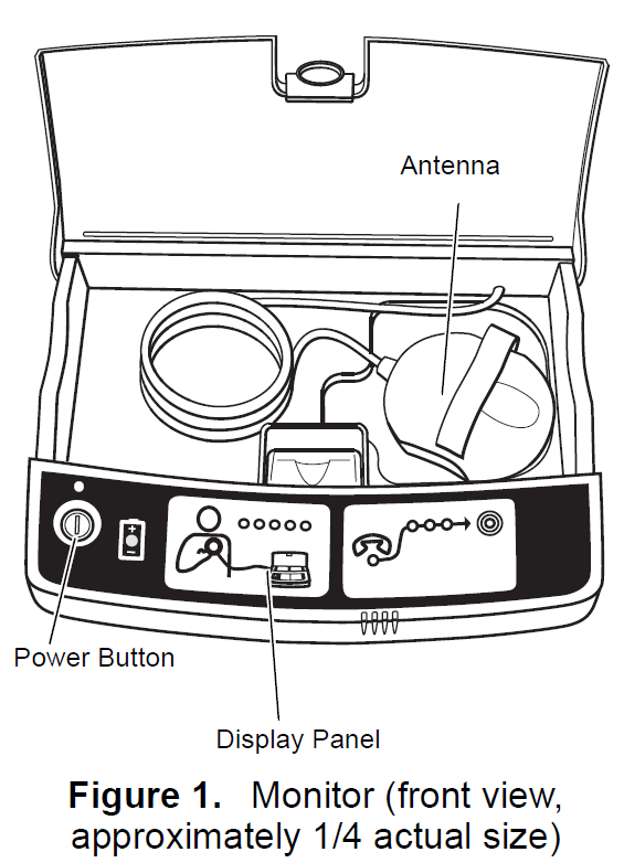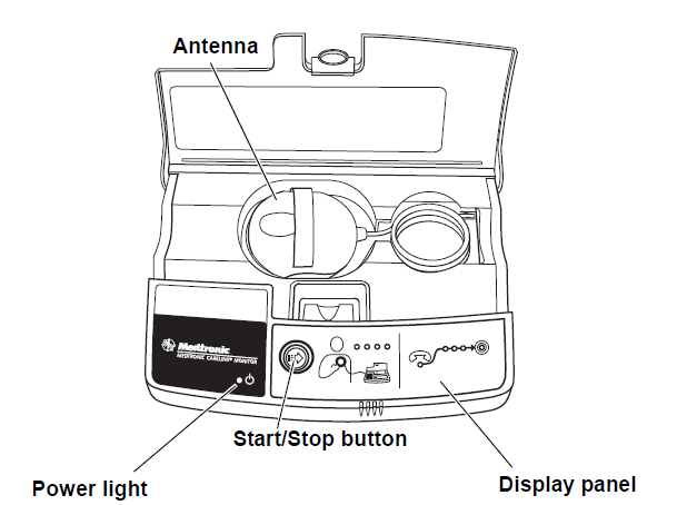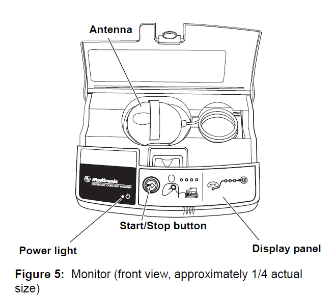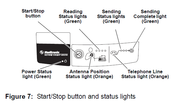 Press the Start/Stop button on the front of the monitor to send your heart device information to your clinic. See Figure 5 or 1.