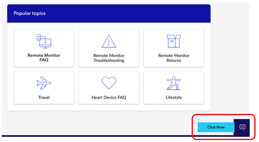 The MyHeartDevice website includes a personalized chat feature that is available anytime, night or day. Click on the “Chat Now” icon on the bottom right corner of your screen to begin a chat session.