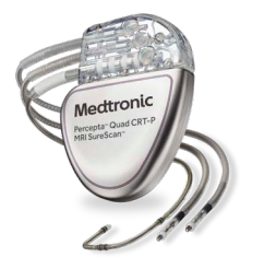 INDICATIONS The Percepta/Serena/Solara CRT-P MRI SureScan Systems are indicated for NYHA Functional Class III and IV patients who remain symptomatic despite stable, optimal heart failure medical therapy and have LVEF ≤ 35% and a prolonged QRS duration and for NYHA Functional Class I, II, or III patients who have LVEF ≤ 50%, are on stable, optimal heart failure medical therapy if indicated and have atrioventricular block (AV block) that are expected to require a high percentage of ventricular pacing that cannot be managed with algorithms to minimize right ventricular pacing. Optimization of heart failure medical therapy that is limited due to AV block or the urgent need for pacing should be done post-implant. Rate adaptive pacing is provided for those patients developing a bradycardia indication who might benefit from increased pacing rates concurrent with increases in activity. Dual chamber and atrial tracking modes are indicated for patients who may benefit from maintenance of AV synchrony. Antitachycardia pacing (ATP) is indicated for termination of atrial tachyarrhythmias in patients with one or more of the above pacing indications. A complete SureScan pacing system is required for use in the MR environment. A complete SureScan pacing system includes a SureScan device with Medtronic SureScan leads or a Model 6725 pin plug for the right atrial port. To verify that components are part of a SureScan system, visit www.mrisurescan.com. CONTRAINDICATIONS The Percepta/Serena/Solara CRT-P MRI SureScan Systems are contraindicated for concomitant implant with another bradycardia device and concomitant implant with an implantable cardioverter defibrillator. There are no known contraindications for the use of pacing as a therapeutic modality to control heart rate. The patient’s age and medical condition, however, may dictate the particular pacing system, mode of operation, and implant procedure used by the physician. Rate-responsive modes may be contraindicated in those patients who cannot tolerate pacing rates above the programmed Lower Rate. Dual chamber sequential pacing is contraindicated in patients with chronic or persistent supraventricular tachycardias, including atrial fibrillation or flutter. Asynchronous pacing is contraindicated in the presence (or likelihood) of competition between paced and intrinsic rhythms. Single chamber atrial pacing is contraindicated in patients with an AV conduction disturbance. Antitachycardia pacing (ATP) therapy is contraindicated in patients with an accessory antegrade pathway. WARNINGS AND PRECAUTIONS A complete SureScan pacing system is required for use in the MR environment. Before performing an MRI scan, refer to the MRI technical manual for MRI-specific warnings and precautions. A complete SureScan pacing system includes a SureScan device with Medtronic SureScan leads or a Model 6725 pin plug for the right atrial port. Any other combination may result in a hazard to the patient during an MRI scan. Changes in a patient’s disease and/or medications may alter the efficacy of the device’s programmed parameters. Patients should avoid sources of magnetic and electromagnetic radiation to avoid possible underdetection, inappropriate sensing and/or therapy delivery, tissue damage, induction of an arrhythmia, device electrical reset, or device damage. Do not place transthoracic defibrillation paddles directly over the device. Certain programming and device operations may not provide cardiac resynchronization. Elective Replacement Indicator (ERI) results in the device switching to VVI pacing at 65 ppm. In this mode, patients may experience loss of cardiac resynchronization therapy and/or loss of AV synchrony. For this reason, the device should be replaced prior to ERI being set. Use of the device should not change the application of established anticoagulation protocols. Patients and their implanted systems must be screened to meet the following requirements for MRI: no implanted lead extenders, lead adaptors, or abandoned leads; no broken leads or leads with intermittent electrical contact as confirmed by lead impedance history; a SureScan pacing system implanted in the left or right pectoral region. Additionally, for patients whose device will be programmed to an asynchronous pacing mode when MRI SureScan is programmed to On, no diaphragmatic stimulation is present at a pacing output of 5.0 V and at a pulse width of 1.0 ms. POTENTIAL ADVERSE EVENTS OR POTENTIAL COMPLICATIONS
